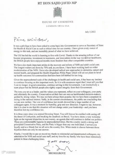 7月5日,英国财政大臣苏纳克和卫生大臣贾维德因对首相约翰逊失去信心而先后辞职,鲍里斯随后任命了他们的继任者。