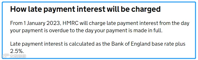 从2023年1月1日起,税局还会征收基于税金的利息。逾期付款利息按英格兰银行基本利率加2.5%计算。