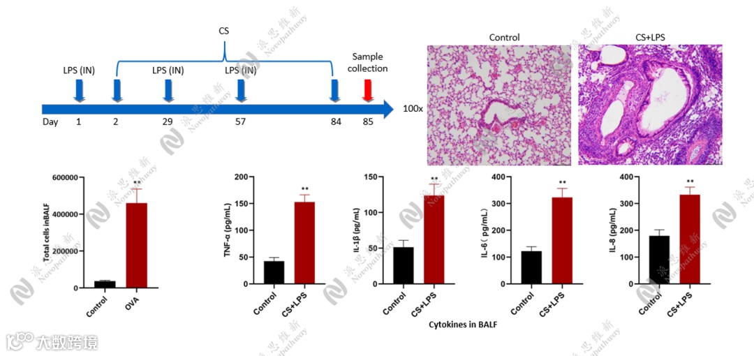 原理:LPS 可激活炎症细胞,引发肺部炎症反应,与香烟烟雾的损伤作用协同,加速并加重肺部炎症及组织破坏,更贴近人类 COPD 的复杂病理过程。