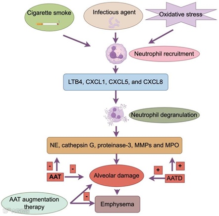氧化应激是导致COPD 的重要一个因素。以香烟为例,香烟烟雾每支含 10^15^ 个自由基,主要为超氧阴离子与羟基自由基[8]。这些活性氧(ROS),引发黏液高分泌,而过多的粘液分泌和中性粒细胞的积累又会产生大量的活性氧(ROS)。ROS会导致抗蛋白酶失活,抗蛋白酶对蛋白酶具有抑制作用,其中α1-抗胰蛋白酶(α1-AT)是活性最强的一种,在由蛋白酶-抗蛋白酶失衡引起的肺组织结构破坏中,α1-AT失活是最关键的。ROS 可氧化α1-AT活性位点,使其与弹性蛋白酶结合能力大幅度降低,加剧蛋白酶失衡。在2000年发表于《美国呼吸与危重症医学杂志》(American Journal of Respiratory and Critical Care Medicine)的一项研究中显示,COPD 患者呼出气冷凝物中8-异前列腺素 F2α(氧化应激标志物)水平较正常人升高 2-3 倍。