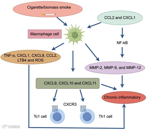 慢性炎症在COPD的发生和发展中起着重要作用,主要影响肺实质和周围气道。这种慢性炎症的特征是巨噬细胞、淋巴细胞和中性粒细胞数量增加。巨噬细胞与中性粒细胞在COPD患者的慢性炎症中起重要作用。受氧化应激影响,中性粒细胞大量募集于气道,释放属于丝氨酸蛋白酶的基质金属蛋白酶(MMP)与中性粒细胞弹性蛋白酶(NE),破坏的肺泡组织,重塑气道。中性粒细胞的免疫反应是氧化应激的诱因,中性粒细胞对于感染的刺激十分敏感,在COPD患者受到感染刺激后,中性粒细胞聚集并吞噬感染源,释放蛋白酶保护细胞和组织,但同时也产生了ROS。巨噬细胞也会聚集在肺泡壁受损部位,且肺气肿的程度与巨噬细胞的数量相关,巨噬细胞在受到激活后释放大量炎症因子,介导炎症反应,在COPD患者的BALF中常常可以检测到大量的巨噬细胞,和与其相应的趋化因子CCL2和CXCL1[9]。