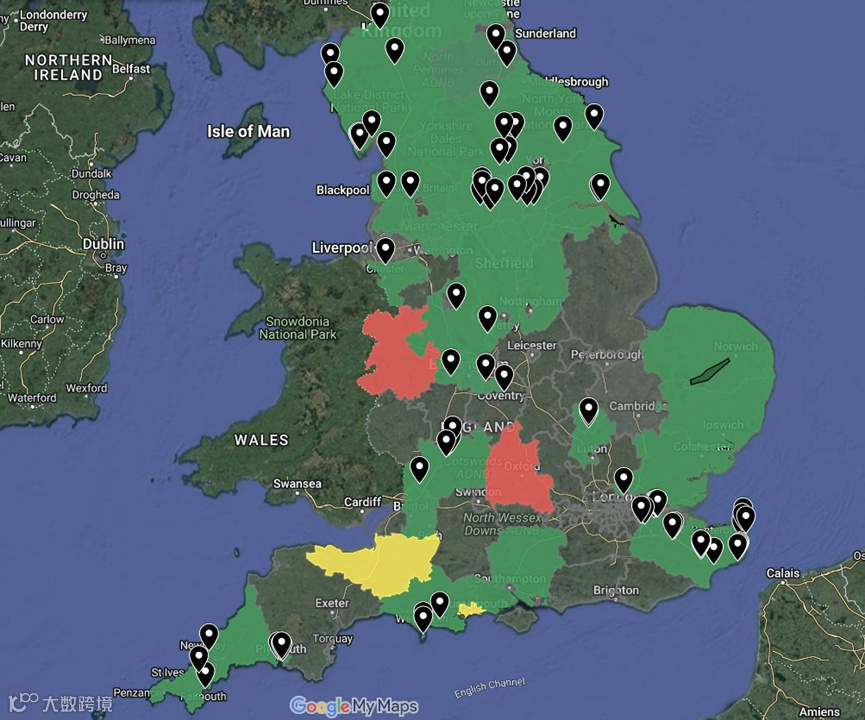 根据一个环保运动者收集的数据,有77个地区被确定为开发区。这些地区包括肯特郡的20个地区、格洛斯特郡的4个大型住宅区、多塞特郡的3个地区、康沃尔郡的3个地区,以及汉普郡、兰开夏郡、彼得堡、西米德兰兹、萨福克、贝德福德和普利茅斯的部分地区。