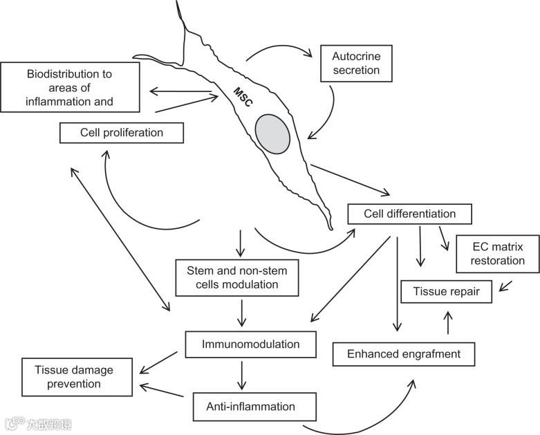 图5:使用同种异体间充质干细胞进行细胞治疗的有益效果的关键机制