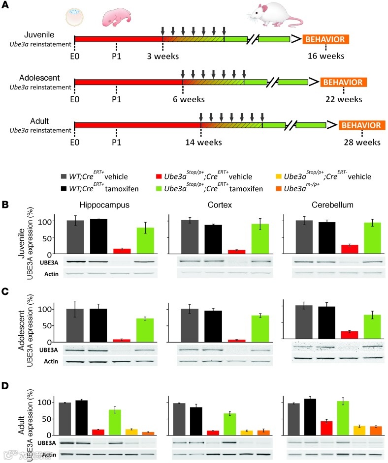 研究表明,由于在神经系统中父本来源的UBE3A基因被一段非编码RNA(UBE3A-ATS)所沉默,只依赖于母本来源的UBE3A的表达,因此,若母本来源的UBE3A发生缺失或突变的话,就会导致天使综合征。因此,研究人员推测使用基因治疗的方式,恢复UBE3A的表达,可以显著改善疾病的临床预后。他们分别采用“幼年小鼠”,3周龄的“少年期小鼠”和6周龄的“成年小鼠”,构建他莫西芬诱导的Ube3a基因敲除模型。Ube3a基因在被诱导敲除后,诱导UBE3A基因再激活,行为测试分别在平均年龄为16周,22周和28周(图4A)实施。他们发现如果在天使综合征模型小鼠成年之后才恢复UBE3A的功能,并不能完全恢复模型小鼠的神经系统缺陷和行为学异常。只有在胚胎发育早期进行干预才能显著改善模型小鼠的神经发育障碍。这表明,患者在年龄越小的时候接受基因治疗其症状改善的程度将会越佳(图4:恢复UBE3A的表达,可以显著改善疾病的临床预后)[3]。