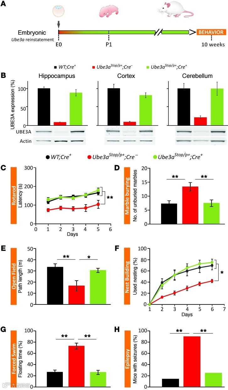 一项研究表明,以C57BL/6小鼠构建Tamoxifen(他莫西芬)诱导的Ube3a基因敲除模型。Ube3a基因在被诱导敲除后,小鼠在旋转棒性能实验(rotarod performance)、大理石掩埋实验(marble-burying)、开放区域探索实验(open field exploration)、筑巢实验以及声音所引起的癫痫发作阈值测试(audiogenic seizure threshold)中,与对照组小鼠相比都具有显著性的差异。而在Ube3a敲除小鼠的早期胚胎中重新导入Ube3a基因则能够避免天使综合征的表型的出现(图3:胚胎再激活术后的小鼠行为学的改变)[2]。