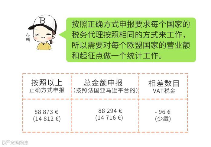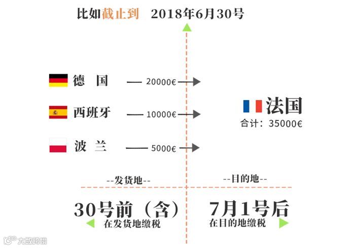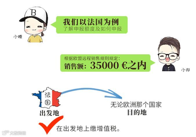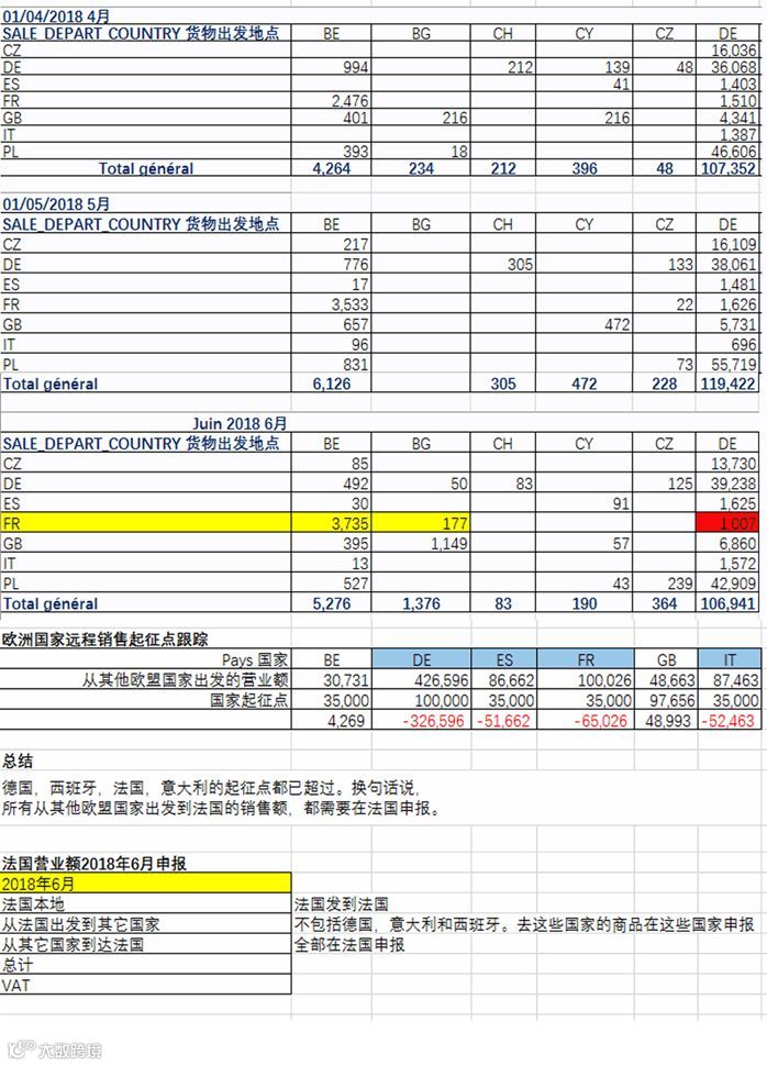 从以上数据可以看出,德国、西班牙、法国、意大利的起征点都已超过。换句话说,所有从其他欧盟国家出发到法国的销售额,都需要在法国申报。总而言之:銷售額累計在35000€以內(注意:此额度会随着欧盟远程销售规定的调整而变化),在發貨國進行申報;銷售額累計超出35000€后,需在銷往國進行申報。