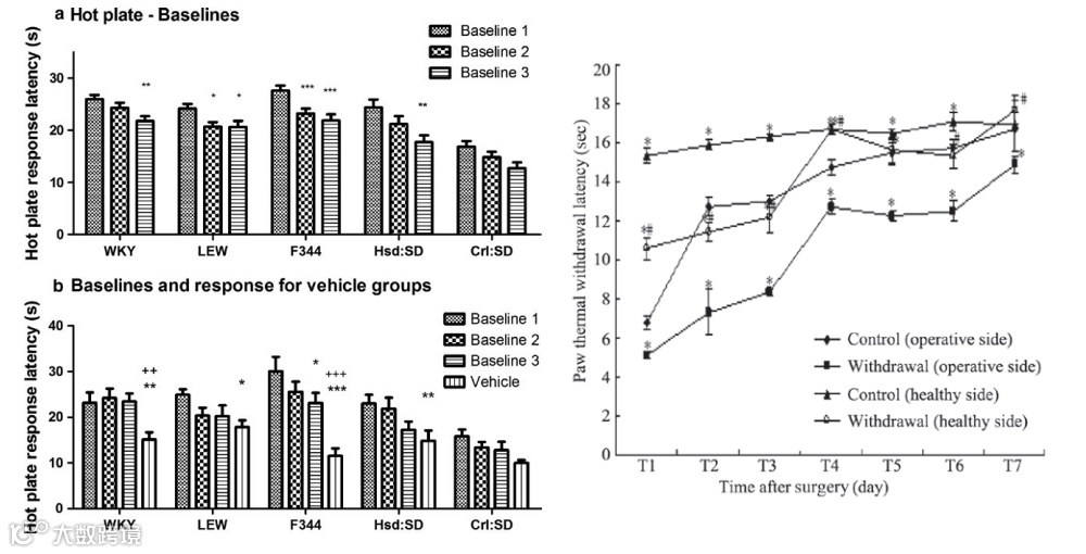 采用一定功率之辐射热,从下向上照射动物之脚底测定其回缩潜伏期,或采用后脚浸泡方法测试一定温度下后脚回缩潜伏期;或采用后脚浸泡方法测试一定温度下后脚回缩潜伏期;也有采用不同温度的热探头刺激以观测后脚回缩阈值。[11]