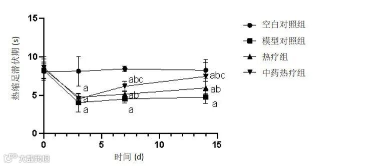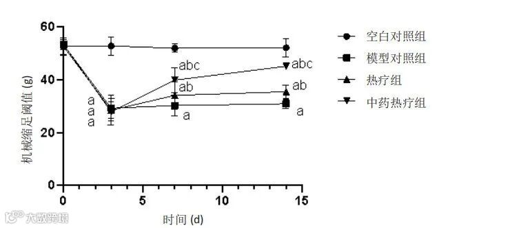 神经病理性疼痛(neuropathic pain:NP)是指躯体感觉系统损伤或疾病造成的疼痛。采用健康雄性SD大鼠,经L5脊神经结扎术制备神经病理性疼痛大鼠模型。热疗组使用45℃盐水浸泡热敷大鼠双侧足少阳胆经循行部位;中药热疗组使用45℃中药液浸泡同部位。