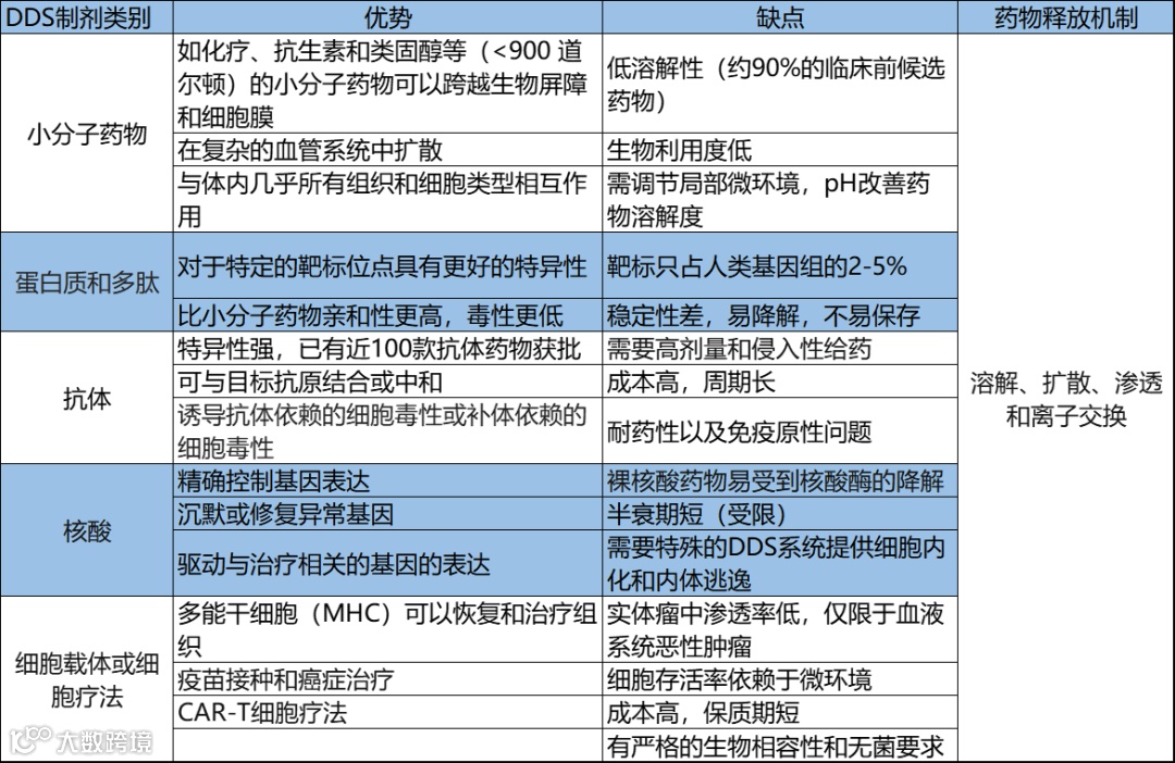 DDS药物递送系统发展至今,无论是为持续药物输送而开发的第一代DDS Spansule技术,还是包括小分子、蛋白质和肽、单克隆抗体(mAb)、抗体毒素共聚物(ADC)、核酸和活细胞在内的第二代DDS提供的新的治疗功能,1)对药物本身的结构改造;2)药物微环境的修饰;3)药物输送系统的设计,通过控制药物与其微环境之间的相互作用来促进药物递送。以其实现增加药物有效利用率,减少药物使用剂量,提高疗效降低治疗成本与减少毒副作用的目的。