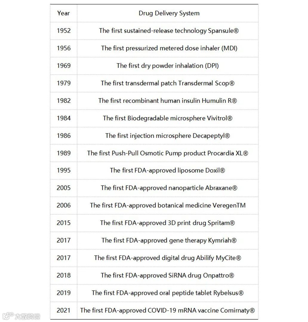 第二代(1980-2017)DDS(例如,脂质体、纳米颗粒、微球和基因传递)纳米药物和智能化输送系统得到了更多关注。1995年,脂质体Doxil®成为第一个上市的纳米药物(治疗HIV相关的卡波氏肉瘤和多发性骨髓瘤)[7]。2005年上市的 Abraxane®是第一个基于纳米技术的靶向DDS制剂(用于局部晚期或转移性三阴性乳腺癌)。2015年,Spritam®是第一个基于3D打印技术的DDS新药(适用于局部性癫痫)。2017年,FDA批准第一个基因治疗DDS药物Kymriah®的上市(CAR-T细胞疗法)[8],同年FDA获批了全球首款数字药物Abilify MyCite®(在抗精神病药物Abilify内部植入盐粒大小的微芯片)。服用药物的同时,借助通讯设备帮助医护人员跟踪患者的服药情况。2018年,FDA批准首个非病毒给药系统的基因治疗药物 Onpattro®(适应症为遗传性转甲状腺素蛋白淀粉样变性)。2019年,首个口服胰高血糖素样肽-1(GLP-1)受体激动剂药物获得FDA批准上市(治疗2型糖尿病)。2021年,FDA批准了首个新冠疫苗Comirnaty®(COVID-19 mRNA疫苗)[9]。