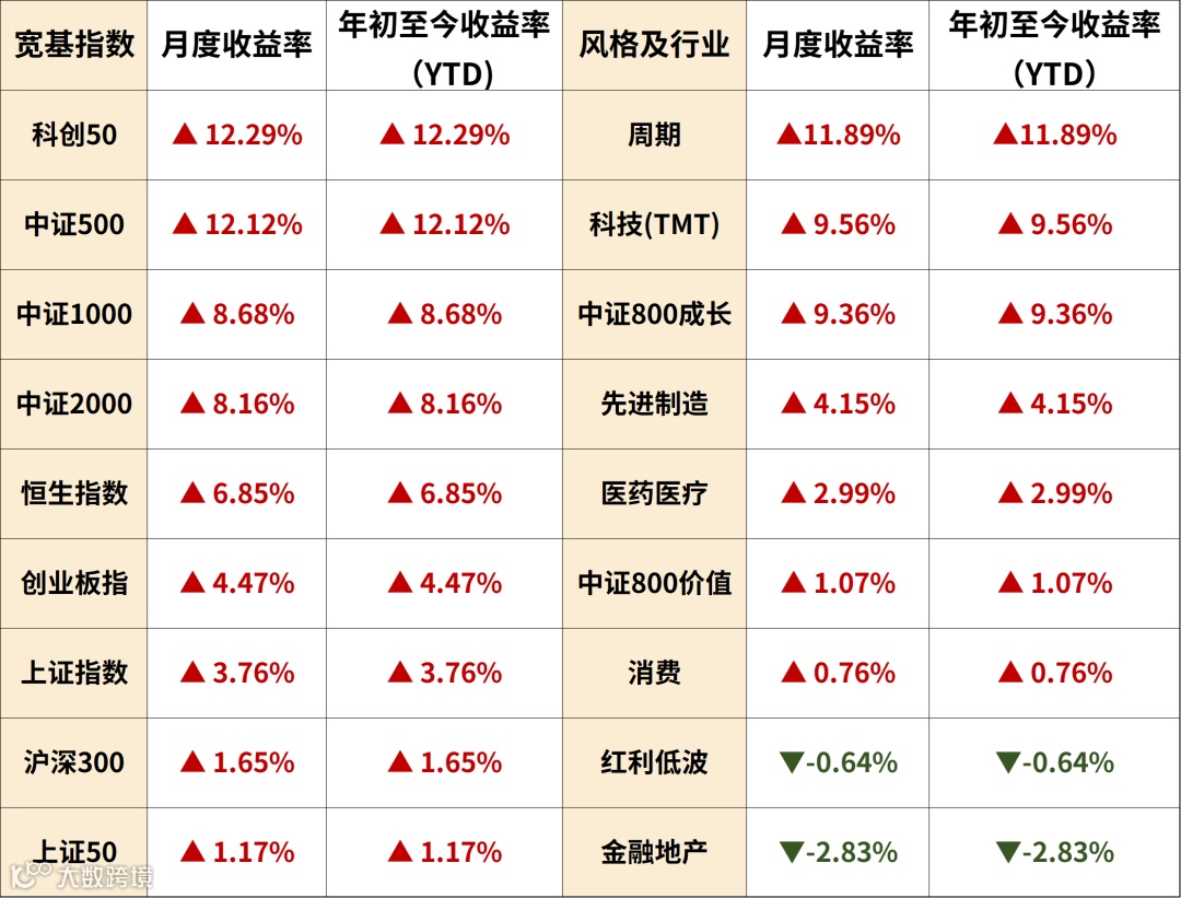 数据来源:wind,申万大类风格指数,月度数据统计区间2026.1.1-2026.1.31,年初至今数据统计区间2026.1.1-2026.1.31。各指数代码如下:科创50(000688)、中证500(000905)、中证1000(000852)、中证2000(932000)、恒生指数(HSI)、创业板指(399006)、上证指数(000001)、沪深300(000300)、上证50(000016)、周期(801271)、科技(TMT)(801275)、中证800成长(H30355)、先进制造(801272)、医药医疗(801274)、中证800价值(H30356)、消费(801273)、红利低波(H30269)、金融地产(801276)。指数历史数据仅供展示,不代表未来表现,请投资者关注市场风险。