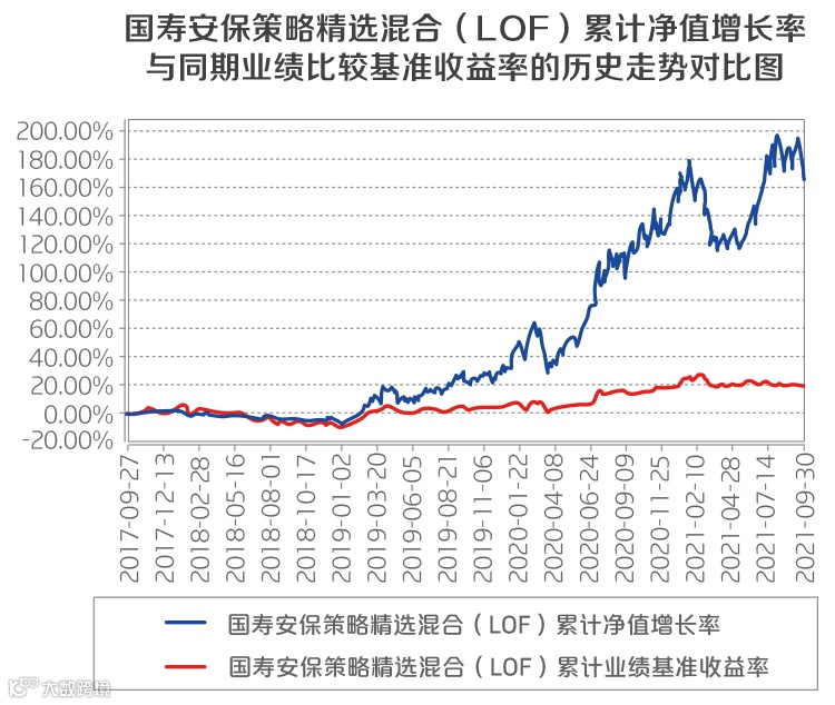 他管理时间超过三年的权益类基金产品均取得了优异的投资业绩。截至2021年9月30日,吴坚管理的国寿安保策略精选(LOF)过去三年净值增长率为182.66%(同期业绩比较基准收益率:23.91%),在海通证券主动开放混合型基金中排名前10%(140/1453)。