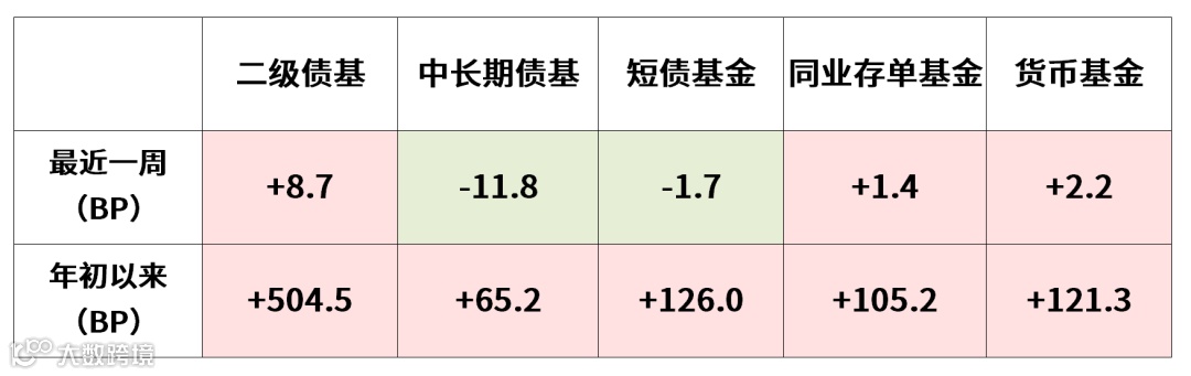 注:数据来源于Wind,口径截至2025.12.07。其中二级债基、中长期债基、短债基金、同业存单基金、货币基金分别对应万得混合债券型二级基金指数(885007.WI)、万得中长期纯债型基金指数(885008.WI)、万得短期纯债型基金指数(885062.WI)、万得同业存单基金指数(885045.WI)、万得货币市场基金指数(885009.WI)。债券利率上行,对应着债券价格下跌,意味着固收类产品的净值趋于震荡或下滑,投资收益下降。反之,债券利率下行,对应着债券价格上涨,意味着固收类产品净值上行,投资收益上升。基金净值上涨1BP=上涨0.01%。