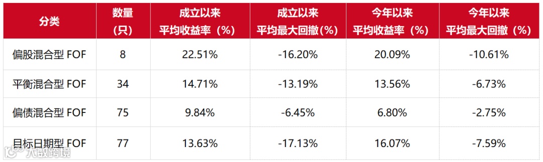 从产品类型来看,个人养老金基金主要分为养老FOF基金和养老指数基金两大分类。养老FOF基金作为最早纳入个人养老金账户的基金类型,长期表现尤为稳健,超过97%的养老FOF基金自成立以来实现正收益,其中偏股混合型FOF表现最优,成立以来平均收益率达到22%。
