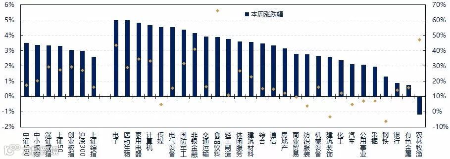 股票市场方面,在全球市场普遍调整背景下,A股强于全球市场走势。全周上证综指,中小板指和创业板指分别上涨2.61%,3.38%和3.03%,中小创相对主板超额收益依然明显。从行业指数来看,电子(5.00%)、医药生物(4.99%)、家用电器(4.82%)、计算机(4.66%)、传媒(4.54%)等行业涨幅居前,农林牧渔(-1.19%)、有色(0.75%)、银行(0.88%)、钢铁(1.31%)、采掘(1.95%)等行业涨幅靠后。