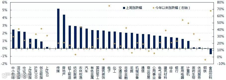 股票市场方面,上周A股市场持续反弹,行业轮动向上。上证综指,中小板指和创业板指涨跌幅分别为2.36%,1.77%和2.41%。从行业指数来看,建筑装饰(5.23%)、农林牧渔(4.92%)、房地产(4.74%)、银行(4.50%)、综合(4.18%)等行业表现相对较好,休闲服务(-0.09%)、军工(0.03%)、有色(0.98%)、电子(0.99%)、传媒(1.11%)等行业表现靠后。