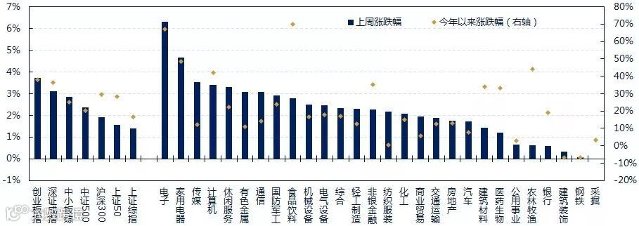 股票市场方面,上周市场出现反弹,和我们前期预测阶段性调整过半,无需担忧的逻辑比较一致。上证综指,中小板指和创业板指涨跌幅分别为1.39%,3.17%和3.72%。从行业指数来看,电子(6.31%)、家电(4.66%)、传媒(3.52%)、计算机(3.41%)、休闲服务(3.31%)等行业表现相对较好,采掘(0.00%)、钢铁(0.07%)、建筑装饰(0.34%)、银行(0.58%)、农林牧渔(0.61%)等行业表现靠后。