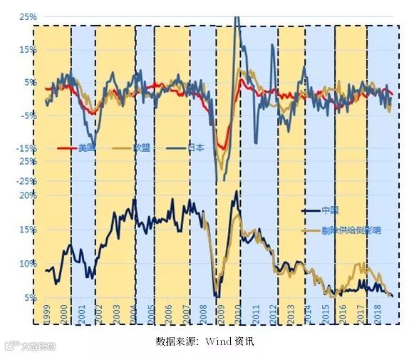 一是看周期,共振周期仍在延续。沿用安信证券高善文博士的方法,将供给侧改革的因素做结构性的剔除,可以看到本轮周期尤其是工业生产层面的周期是基本全球同步的,其中美国相对更强的周期且持续性更强,回落的时点也相对错后,但大的趋势并没有发生变化。可以观察到,多数国家本轮周期的相对顶点位置已经在2017年初到2017年中后段确认,即使美国的周期更具持续性也可以确认全球本轮周期在2018年三季度确认,后续大概率是全球共振式的回落,虽然各国有时滞,但是共振式的回落大概率还会持续接近1年的时间(一般为1年半左右,目前已经完成半年左右),甚至不排除更长。对应可以确认的数据是,全球PMI、工业订单、消费者信心、全球贸易等数据接连验证。