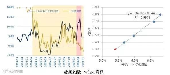 二是看国内经济的动力,我们的判断也基本与年度报告一致。首先在生产端我们认为中期来看仍不容乐观。如果仅看国内生产层面,由于没有太多边际新增的因素,同时服务业发展速度更快,因此工业增加值保持在5.5-6%的区间上是大概率的。而结合外部因素,由于抢出口的因素,2018年下半年出现了比较显著的抢出口现象,因此在2019年上半年会出现出口数据有比较显著的回落。从2014年以来的数据分析,出口交货情况对工业生产的影响非常大,这也非常可以理解,在PPI持续走弱后和供给侧改革推进阶段,国内的工业生产是难以由于内部经济周期向上而“放量”的,所以外部因素成为了主导因素,而下行阶段的2018年下半年有被抢出口情况所对冲,所以如果我们定性的剔除这一部分影响,内生的工业增加值大概率在去年下半年就逐渐回落到5.5%左右的水平。以此数据外推,我们认为2019年1季度GDP增速为6.3%,二季度仍有进一步下行的压力,而后会相对偏向于平稳。需要提示,我们这部分的“简单回归”是一个比较偏定性的判断,实际在定量判断上仍有较大的瑕疵。