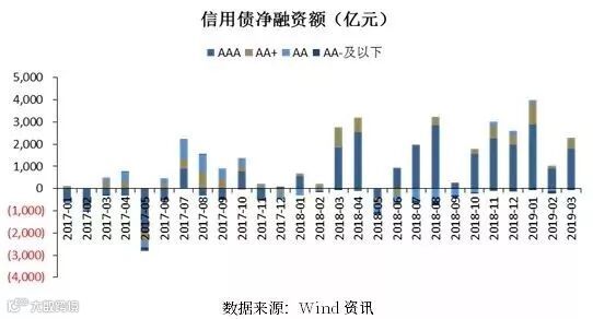3月信用债融资继续延续1-2月的回暖态势,全月信用债净融资额为2200亿元。融资结构方面,融资分层的结构性问题仍未出现明显改观。19年3月AA级净融资额为25亿,但低于18年11月-19年1月100亿以上的净融资规模。AA-及以下级别的信用债净融资额持续为负值。