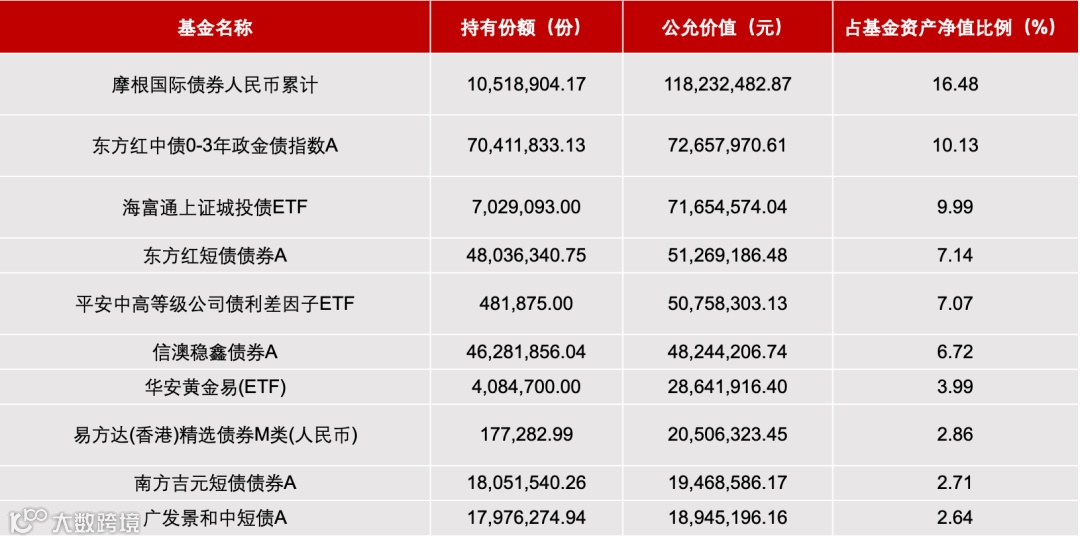 前十大重仓股中,不仅有主要投资国内债券的债基,同时包括投资港股的易方达(香港)精选债券M类(人民币),投资全球市场的摩根国际债券人民币累计以及投资黄金的华安黄金易(ETF)。