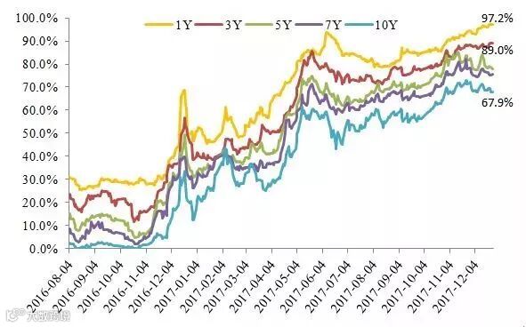 2017年以来,由于企业盈利有所好转,以及债市维稳力度较强,实质违约数量减少。2015和2016年新增的实质违约发行人家数分别是8和16家,2017年以来新增违约发行人只有5家。个别企业发生违约并未引起市场的恐慌情绪,未对市场造成过大冲击。尽管2017年实质违约数量有所减少,但公告存在兑付风险的案例仍然不少,特别是一些行业龙头民企的突发事件明显超出市场预期,如万达、魏桥、西王等。同时城投企业负面事件增多,如退出融资平台、担保函撤销、违规融资被罚等事件,造成城投信仰进一步动摇。18年经济韧性仍然较强,由于基本面恶化造成信用违约频发的概率较小,因此预计18年信用违约仍不会对市场造成过大冲击,信用风险仍然不是市场的核心矛盾。18年信用风险的核心在于强监管环境下信用债配置需求萎缩以及市场风险偏好下降,导致再融资环境恶化,企业再融资难度上升;特别是低评级的发债主体融资渠道有限,将面临较大的再融资压力,进而导致流动性风险和违约风险。