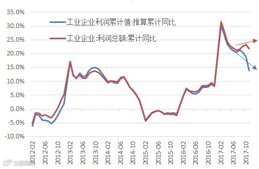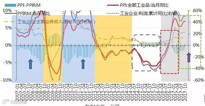 需求非崩塌式的回落,盈利回落的速度是有限的,但是结构性变化可能会出现。如下图所示,蓝色和橙色区域主要是由于需求的变动,量的因素显著大于价格的因素,因为即使价格已经出现挤压,盈利仍是向好的。箭头的位置则表示了需求崩塌阶段,挤压的动力开始大幅增强。需求钝化阶段则是过剩产能累积中需求和价格统一下行,导致盈利整体的低迷,行业需要出清和修复。供给侧改革的变化在于需求拉动不是主要因素,而价格因素是主要因素。因为经济整体多因素共振下上行,盈利进一步修复,这一阶段主要来自于需求的拉动。但是,如果基于我们的判断,需求非崩塌式的回落,盈利回落的速度是有限的,但是结构性变化可能会出现。这种结构性变化是2018年的主要风险点,即2018年如果出现显著超预期的物价上行可能出现更加显著的盈利挤压,那么在行业配置上就需要做进一步的梳理,相对而言上游资源品受益更多,但目前仅是一个需要关注的潜在风险。