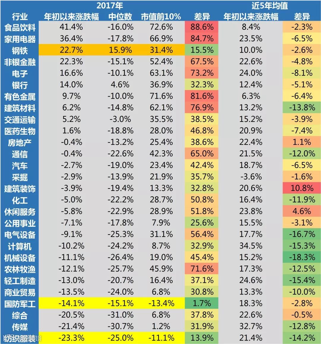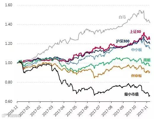 2017年股票市场呈现出几个显著特点,把握住这几个特点有助于我们对2018年做进一步展望。一是2017年股票市场出现小幅上行,这与宏观经济相对较平稳的走势是一致的,但大势节奏受市场对宏观经济的预期变动、政策走势变动影响较大。二是结构性行情为2017年的投资主线,龙头白马显著强于市场,而市场分化严重,小市值、创业板均受到市场冷落。一个有趣的研究表明,以市值作为计算标准,龙头(top10%市值)全年走势普遍好于市值中位数个股,其中食品饮料、家用电器、电子、有色等行业尤其明显,仅有国防军工、纺织服装等个别行业相对趋同。整体来看,2017年结构重于大势,风格重于行业选择。