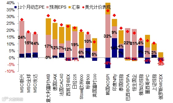 A股全球化进程中,A股的估值与流动性需要放进更大的视角中。在经济扩张盈利修复但通胀维持温和的宏观背景下,股权类资产表现最好,这一点可以在全球的市场上看到。其中,新兴市场受益于基本面的不断改善、以及整体弱美元的环境下,明显领跑发达股市,且在所有资产中表现最好。特别要说明的是,尽管乐观情绪下的估值扩张依然对市场上涨起积极作用,但盈利增长才是最主要贡献。