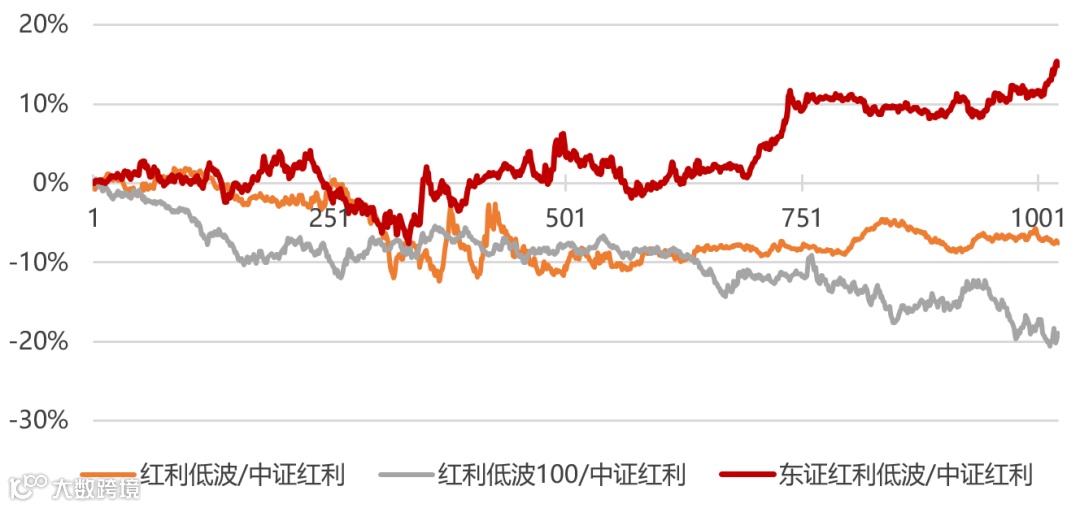 数据来源:Wind,使用对应的全收益指数计算各指数发布日后相对中证红利全收益的超额表现,横坐标为指数自发布后的交易天数,红利低波、红利低波100、东证红利低波、中证红利对应的全收益指数代码分别为H20269、H20955、921446、H00922