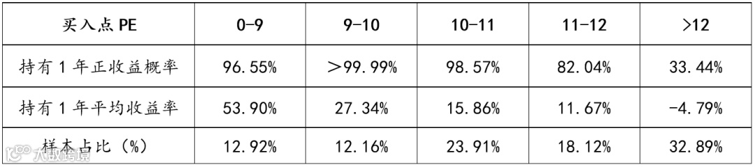 若以1年为观察窗口,买入时指数的估值对投资结果有一定的参考意义。数据显示,自指数基日至2023年底,若在10倍以下PE买入,则持有1年的正收益概率在95%以上,平均收益率也超过25%,持有体验较好。若在较高的PE下买入,则持有1年正收益概率会明显下降,需要持有更长的时间等待指数修复。总体上看,买入时估值越低,则持有体验相对越好。(图表5)