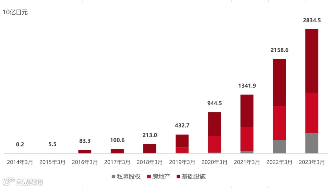 除传统资产外,在长期低利率环境下,另类资产也是非常重要的资产类别,这些资产可以提供更加多元的收益来源,主要包括房地产、私募股权基金、对冲基金以及衍生品等。2013年起,GPIF开始积极参与另类资产投资,最初仅为基础设施,此后逐步拓展至私募股权和房地产领域,目前另类投资产的整体管理规模接近3万亿日元。