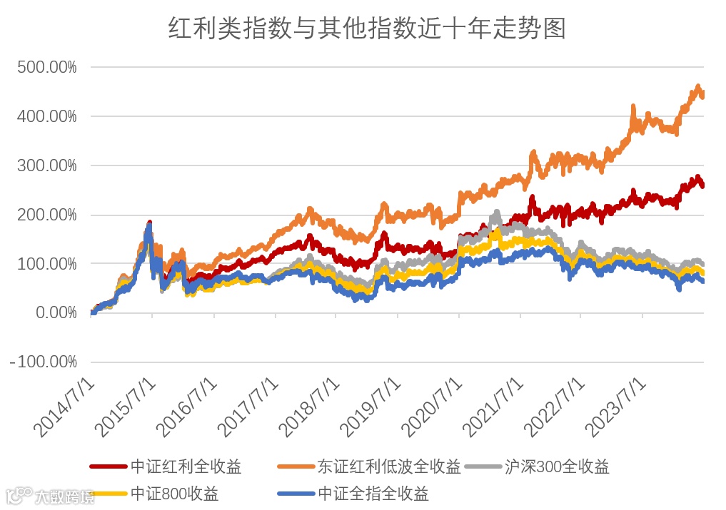 注:数据来源Wind,统计区间2014.7.1至2024.6.30。全收益指数包含了成分股的分红,并对分红自动进行红利再投资。中证红利全收益指数代码H00922,东证红利低波全收益指数代码921446,沪深300全收益指数代码H00300,中证800全收益指数代码H00906,中证全指全收益指数代码H00985。