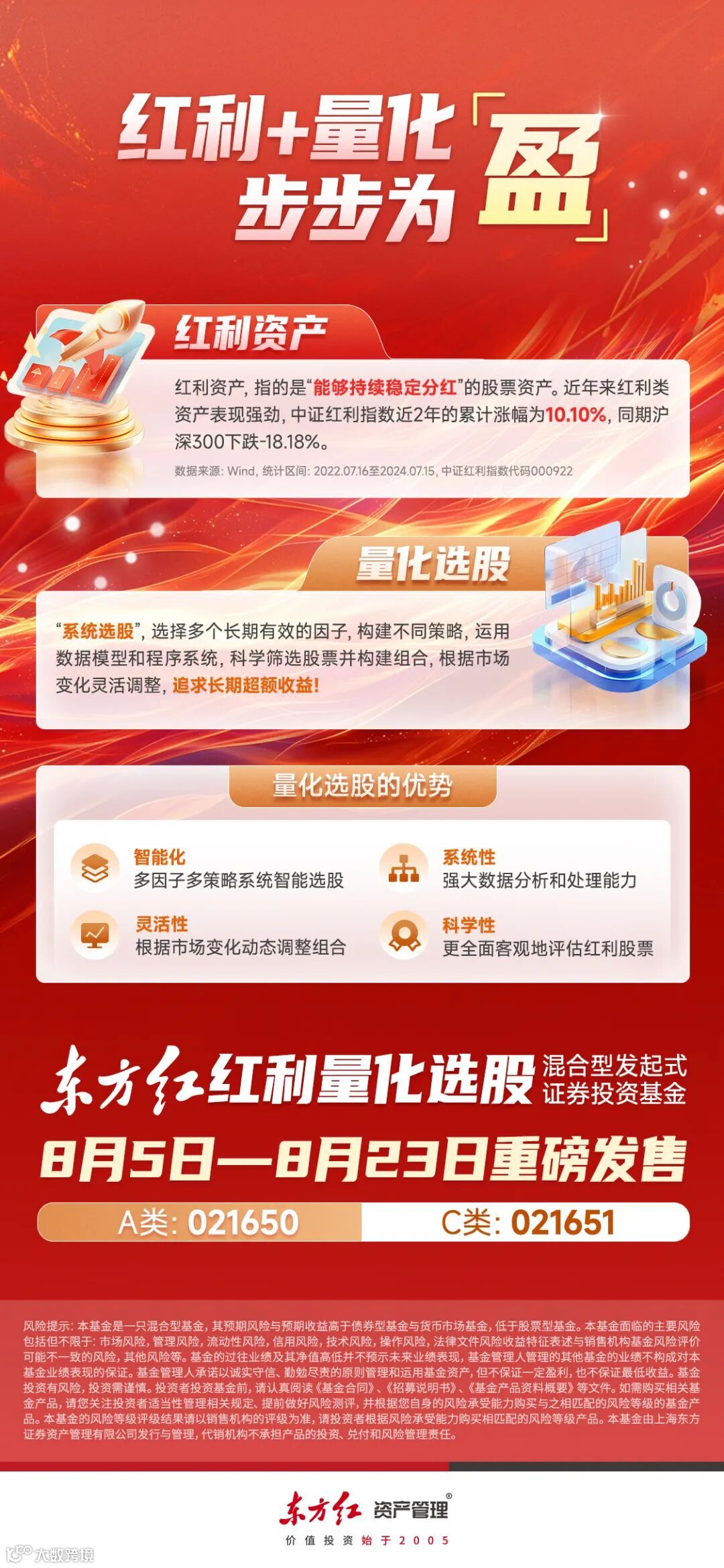 如何从红利资产中获得更好的投资效果呢?在创设东方红红利低波动指数基金的基础上,东方红资产管理量化团队进一步开发出聚焦红利类股票的主动量化产品——东方红红利量化选股混合发起基金(A类021650、C类021651),在红利主题的股票范围内,进一步通过主动量化管理的方式,运用多因子、多策略选股模型,旨在更好地对红利投资进行优化,追求超越业绩比较基准的超额收益。(本基金业绩比较基准为:中证红利指数收益率*85% +恒生指数收益率(经汇率估值调整)*5% +中国债券总指数收益率*10%)
