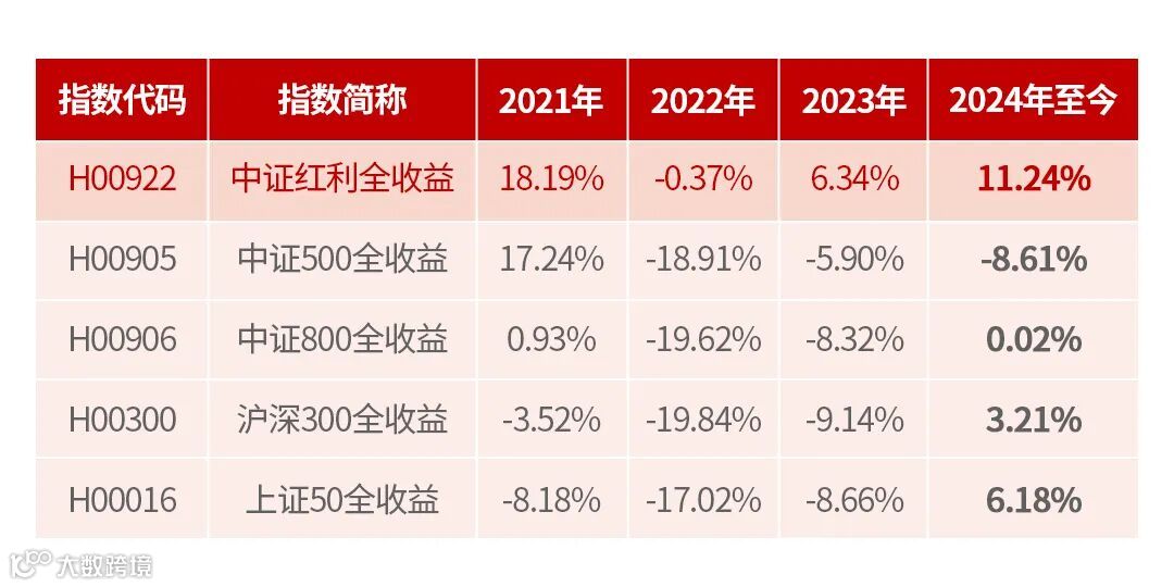 目前红利资产已经“走红”了三年。如下表所示,自2021年至2024年,A股红利类代表指数——中证红利全收益指数,其年度回报分别为18.19%、-0.37%、6.34%、12.05%,既大幅跑赢传统大盘宽基指数,也大幅跑赢中小盘成长类指数。