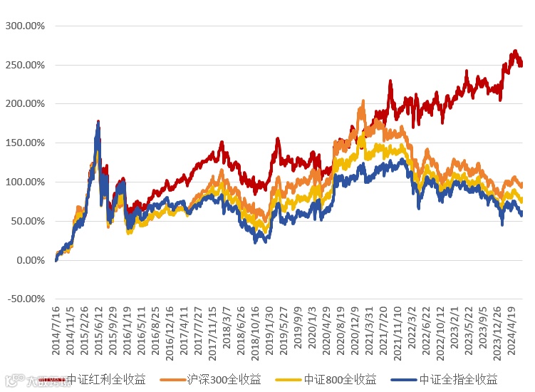 注:数据来源Wind,统计区间2014.7.16至2024.7.15。全收益指数包含了成分股的分红,并对分红自动进行红利再投资。中证红利全收益指数代码H00922,沪深300全收益指数代码H00300,中证800全收益指数代码H00906,中证全指全收益指数代码H00985。指数历史数据仅供参考,不代表未来表现及基金业绩表现。