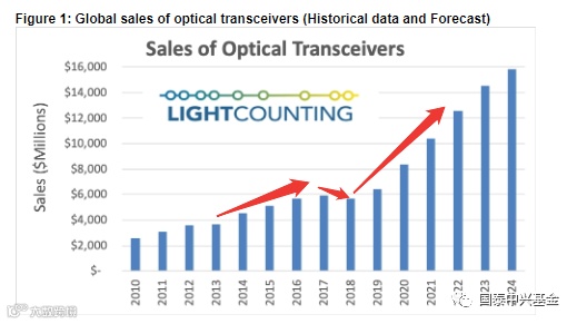 根据统计,2003-2016年光模块市场复合增速达到14%,2018年由于中兴事件,行业增速下滑,未来五年,两个因素有望使全球光模块市场继续保持快速增长: