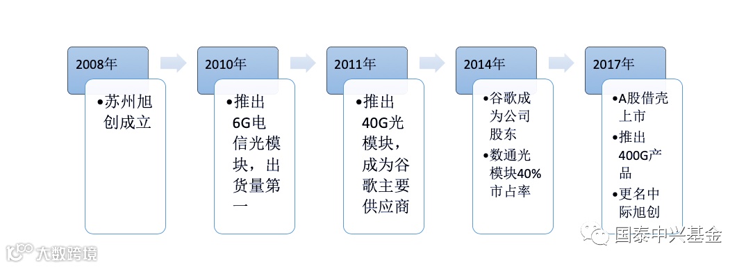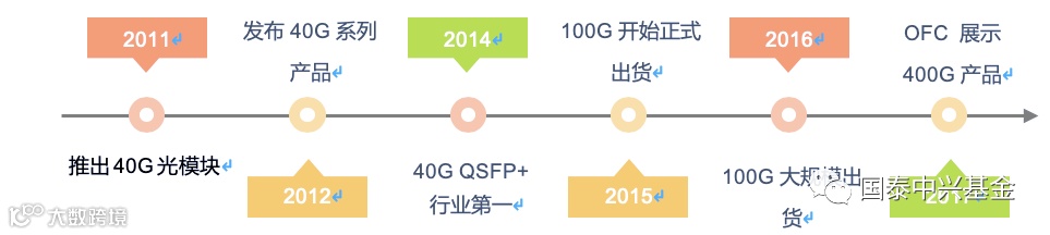 公司成立于2008年,最初服务于电信市场,是一个名不经传的小公司。当时电信市场光模块市场规模小,竞争激烈,公司经营一度陷入低谷。2011年,云数据中心40G需求爆发,公司抓住机遇,凭借过硬的技术能力以及合理的成本成为了谷歌的光模块的主要供应商之一。