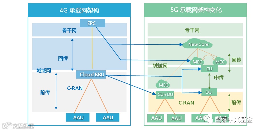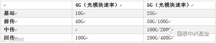 2019年国内正式进入5G元年。5G承载网将从4G时期的两级结构演化到三级结构,同时5G网络频谱相对4G更高,造成基站密度大幅增加,因此5G网络的建设相较4G时代提升了对光模块产品的数量需求、速率要求。保守预测中国5G光模块市场规模将达到400亿元,较4G时代180亿元投资额增长113%。