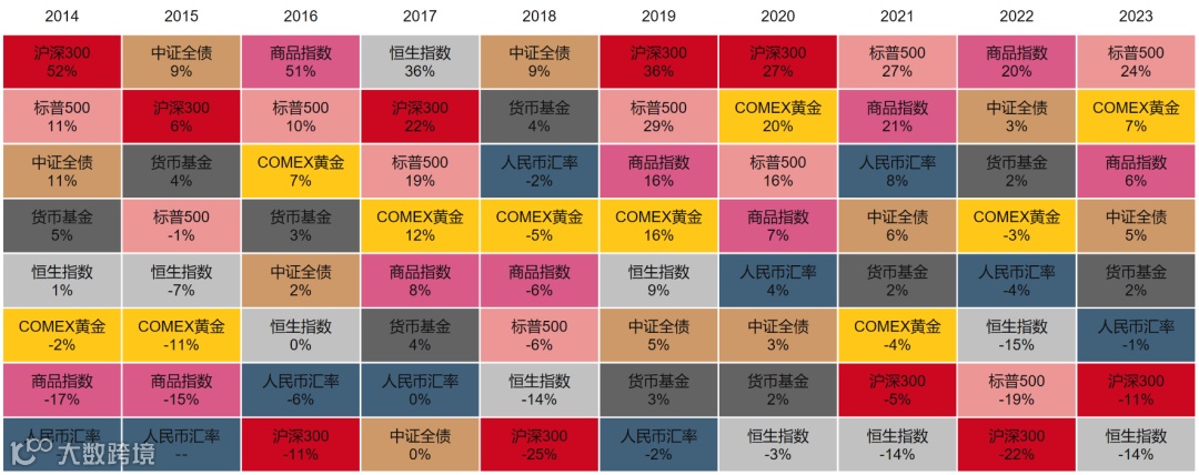 注:沪深300、标普500、中证全债、货币基金、恒生指数、COMEX黄金、商品指数、人民币汇率分别指沪深300(000300.SH)、标普500(SPX.GI)、中证全债(H11001.CSI)、货币基金(H11025.CSI)、恒生指数(HSI.HI)、中信证券COMEX黄金期货(CISGC.WI)、南华商品指数(NH0100.NHF)、CFETS人民币汇率指数(CNYX.IB)。其中CFETS人民币汇率指数(CNYX.IB)在2014年、2015年的数据为空。指数历史数据仅供展示,不代表未来表现。