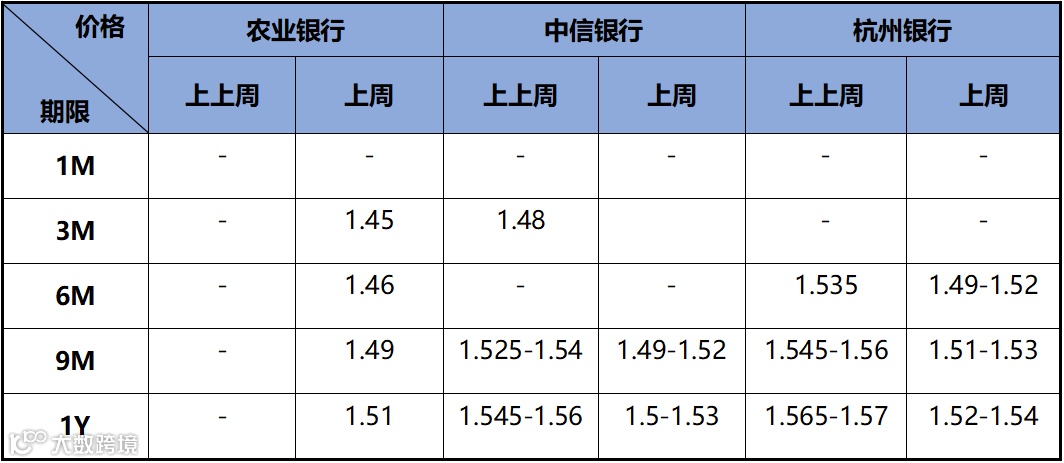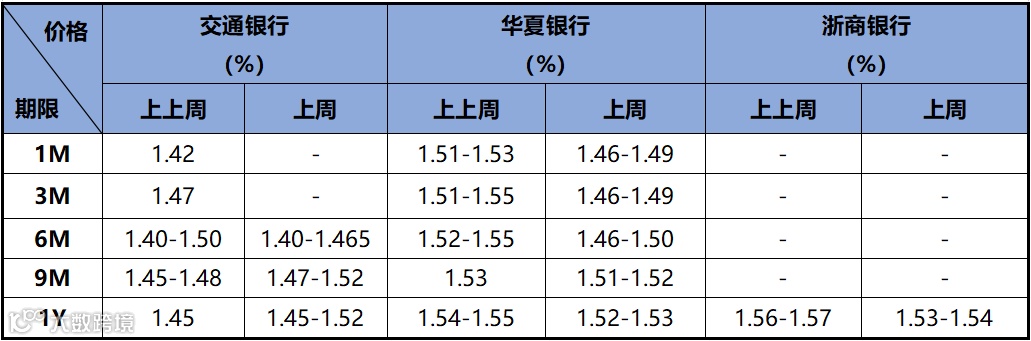 存款价格方面,因同业存款自律新规传言再起,市场对定期存款需求显著提升,定存价格相对下降。近两周存款市场情况如下表所示: