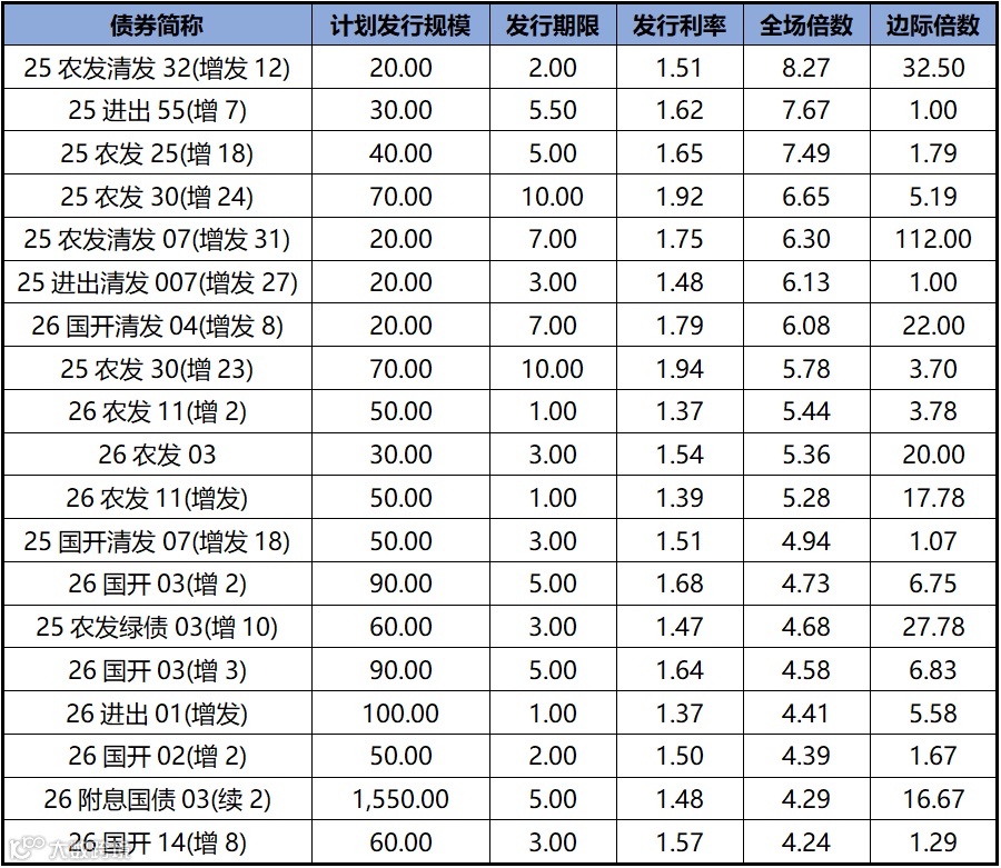 利率债发行方面,上周发行投标热度较上上周有所上涨,热门券种2年期25农发清发32(增发12),全场倍数8.27,边际倍数32.5;5年期25进出55(增7)全场倍数7.67,边际倍数1.00。上周利率债发行价格和机构投标情绪如下表所示:
