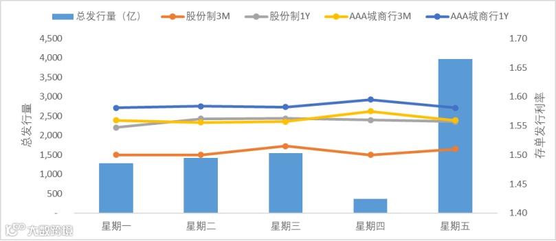 上周5个工作日有529只同业存单发行,实际发行量8588亿,发行量较上上周上行10亿。