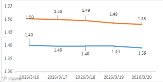 截至3月19日,国债收益率短端下行,长端上行,曲线走抖,10Y-1Y利差为56.84,较3月13日走扩2.75BP,处于近5年39.15%的历史分位。