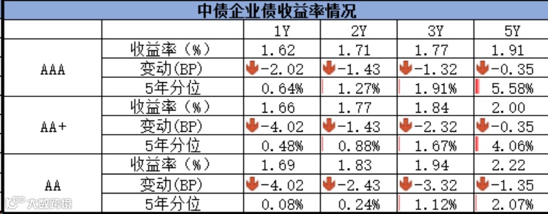 信用债方面,各期限中短期票据和企业债到期收益率整体下行,中债中短期票据到期收益率1年期下行2.19bp,3年期下行1.93bp;企业债到期收益率1年期下行3.48bp,3年期下行2.32bp。
