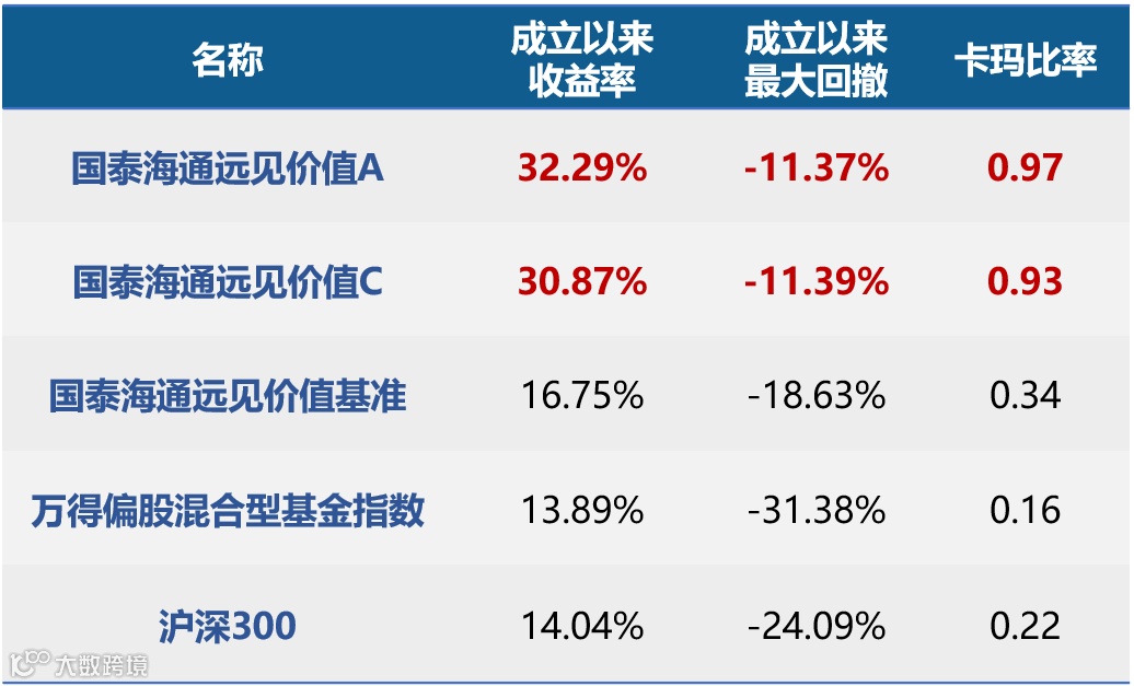 这在他管理的国泰海通远见价值里有所体现。以A份额为例,基金成立以来收益32.29%,跑赢同期偏股混合型基金指数18.40%、跑赢业绩比较基准15.54%。A份额成立以来最大回撤仅-11.37%,低于同期万得偏股混合型基金指数-31.38%、沪深300指数-24.09%的最大回撤。其卡玛比率(衡量风险调整后收益的指标,数额越高越好)为0.97,高于业绩比较基准的0.34和沪深300指数的0.22。这说明,该基金在承担相同风险的情况下,能够为投资者创造更好的回报。[1]