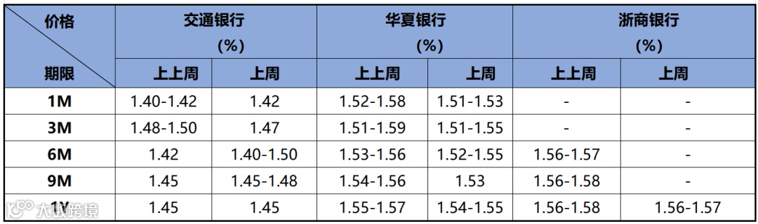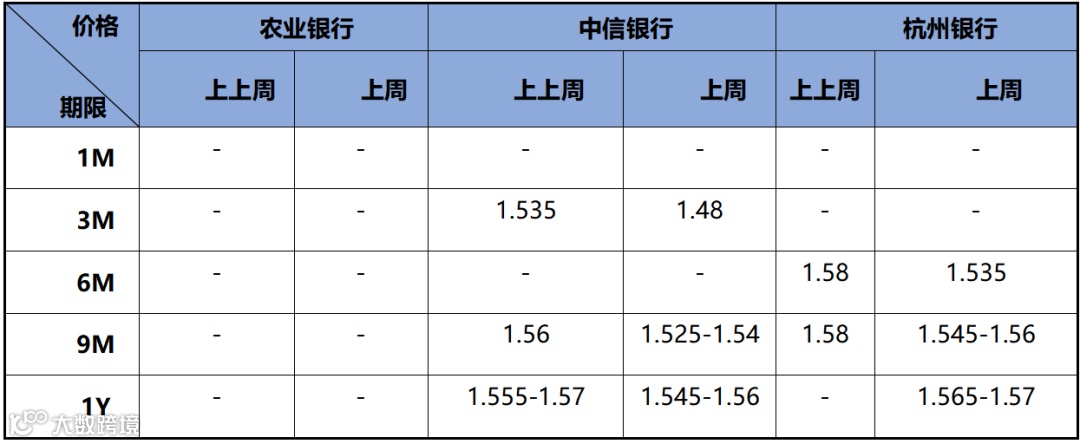 存款价格方面,因同业存款自律新规传言再起,市场对定期存款需求显著提升,定存价格相对下降。近两周存款市场情况如下表所示:
