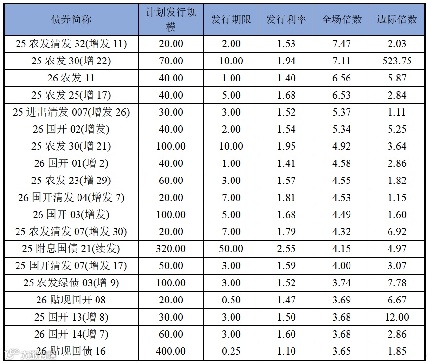 利率债发行方面,上周发行投标热度较上上周有所下降,热门券种2年期25农发清发32(增发11),全场倍数7.47,边际倍数2.03;10年期25农发30(增22)全场倍数7.11,边际倍数523.75。上周利率债发行价格和机构投标情绪如下表所示: