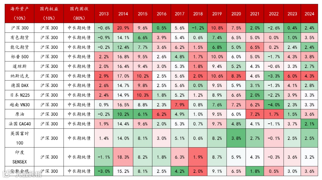 数据来源:Wind数据,数据区间:2013.01.01-2024.06.30,海外资产指数收益率均已经汇率调整。上述指数代码对应:纳斯达克(IXIC),标普500(SPX),道琼斯(DJI),伦敦金现(SPTAUUSDOZ),印度SENSEX(SENSEX),越南VN30(VN30),德国DAX (GDAXI),日本N225(N225),法国CAC40(FCHI),有色期货(IMCI),能化期货(000201.CZC),英国富时100(FTSE),原油(B.ICE),沪深300(000300.SH)