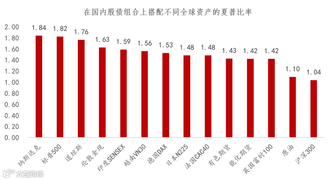 我们可以来看下面这组数据,2013年至今,如果以固定的二八比例配置组合,其中20%的权益资产分成两部分,10%的沪深300和10%的海外权益或商品资产,会发现加入各类海外资产的组合都能在风险收益比上优于20%沪深300+ 80%中长期纯债的组合。